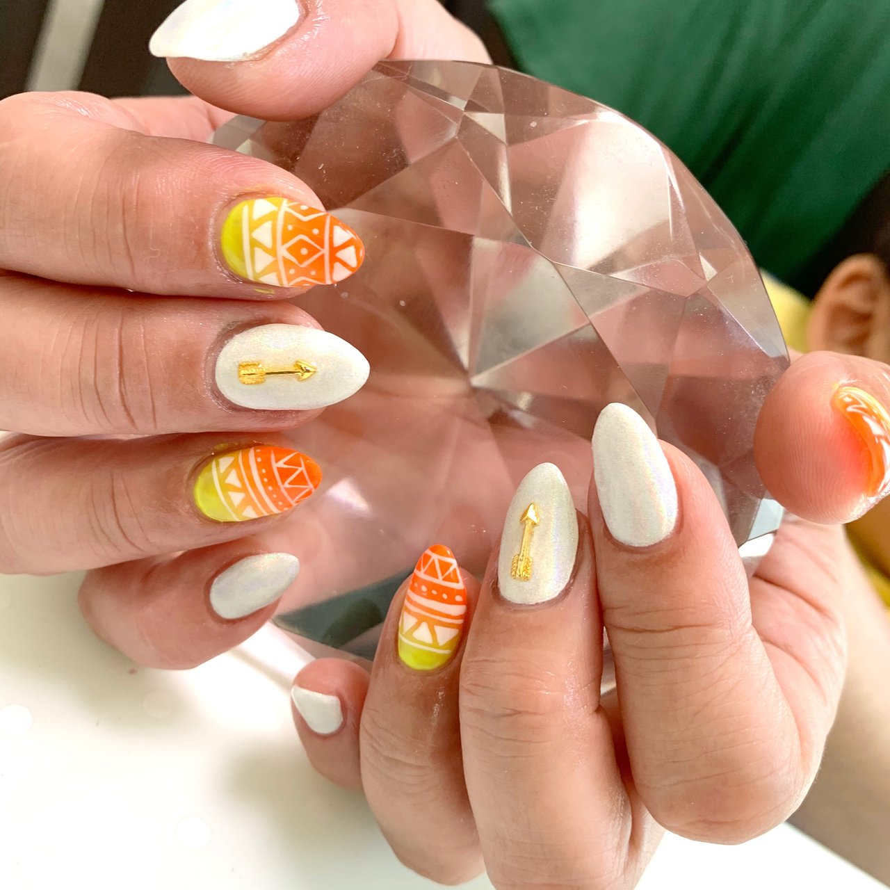 春 夏 オレンジ 白 エスニック ビジュー ゴールド ミラー ライン Plumeria所属 富田 愛のネイル デザイン ミニモ